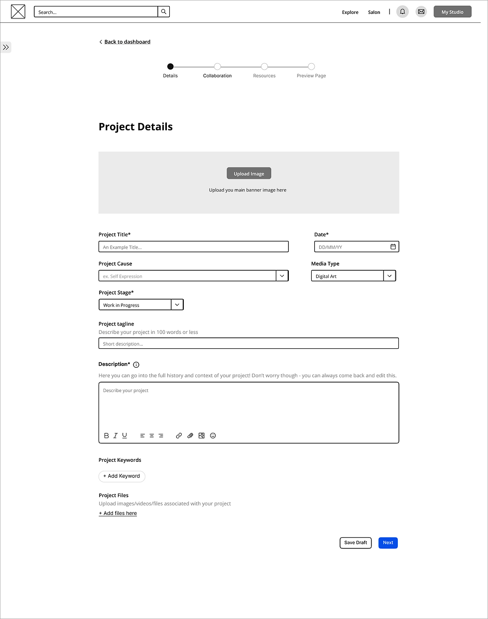 The Studio comprises of the Dashboard, All Projects Page, Project Creation, and the Project Page. To account for this HMW statement, we designed customizable privacy options to control the visibility of projects and posts and toggles to express interest for collaboration or feedback.